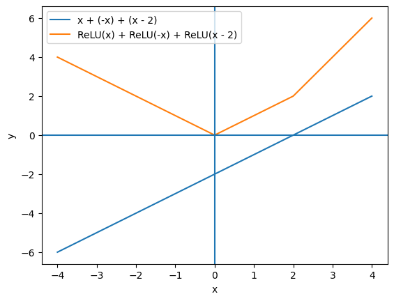 活性化関数をReLUとし、2層(隠れ層が1つ)の1入力1出力のニューラルネットワークは、次のように書ける。