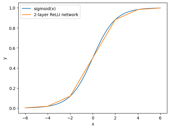 これを使って、実際に ReLU + 線形変換 の組み合わせでシグモイド関数を近似してみる。