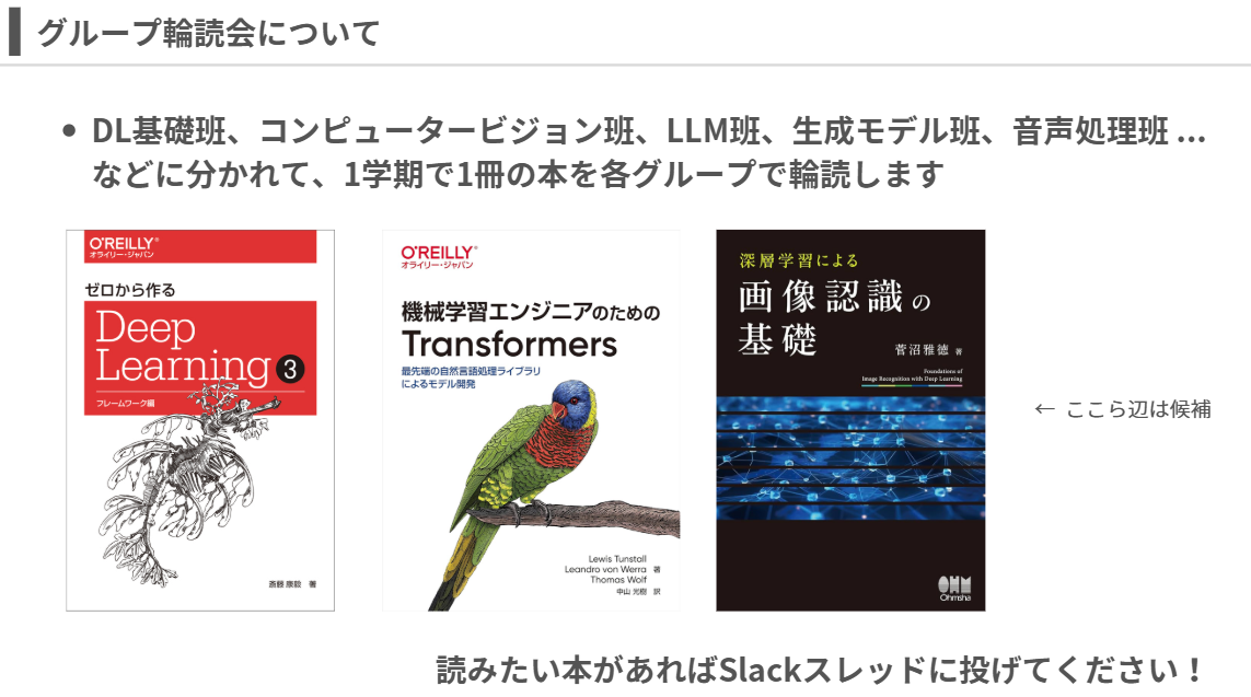 ここで意識したのは、「専門性の高い人の話をみんなで受け身で聞く場」ではなく、同じくらいの習熟度の人が一緒に理解を作っていく場にすることでした。論文だと、どうしても専門性が高くなるほど、他の人にとっては距離のある内容になりやすい面があります。その点、本をベースにした輪読であれば、各グループに合った分野や難易度を設定しやすくなると考えました。
