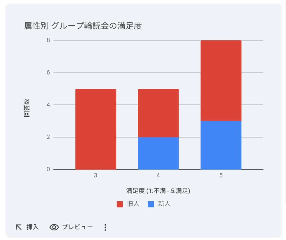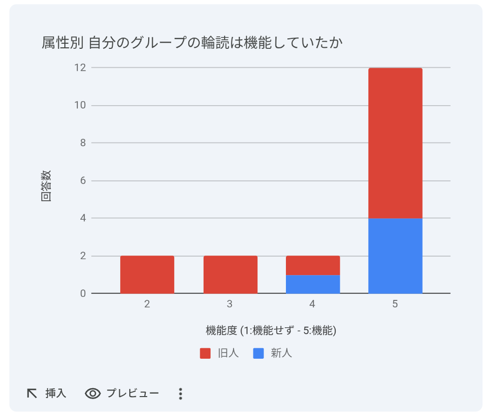 在籍期間の長いメンバーはやや厳しめに評価する傾向が見られましたが、全体としては4〜5を選んだ方が多く、導入した形式に対して一定の手応えはありました。