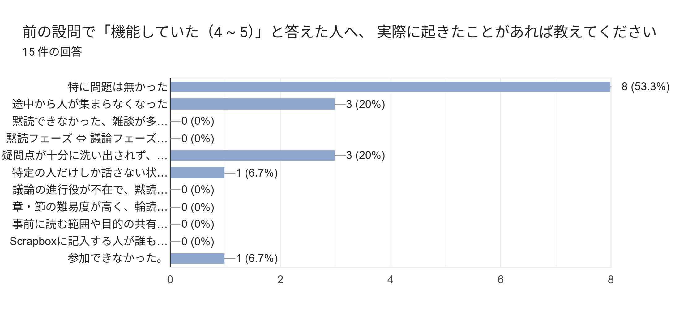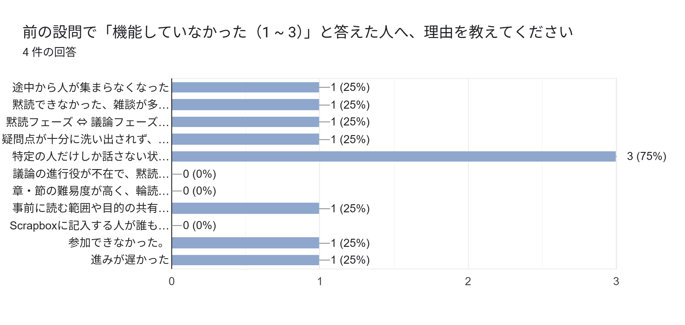 一方で、「自分のグループの輪読が機能していたか」という設問では、2や3を選んだ方も一定数いました。これについて理由を見てみると、特定の人だけが発言する状況が繰り返し起き、議論が一部の人に集中してしまうという課題があったようでした。