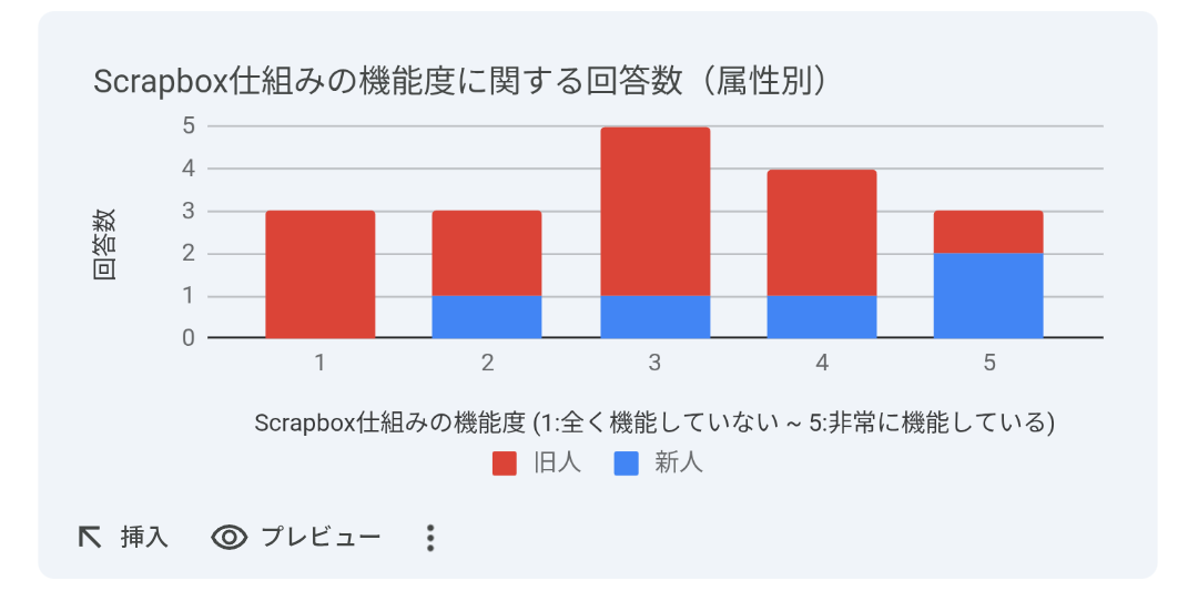 「Scrapboxに書く仕組みがうまく機能していたか」については評価がばらけており、低い評価も見られました。