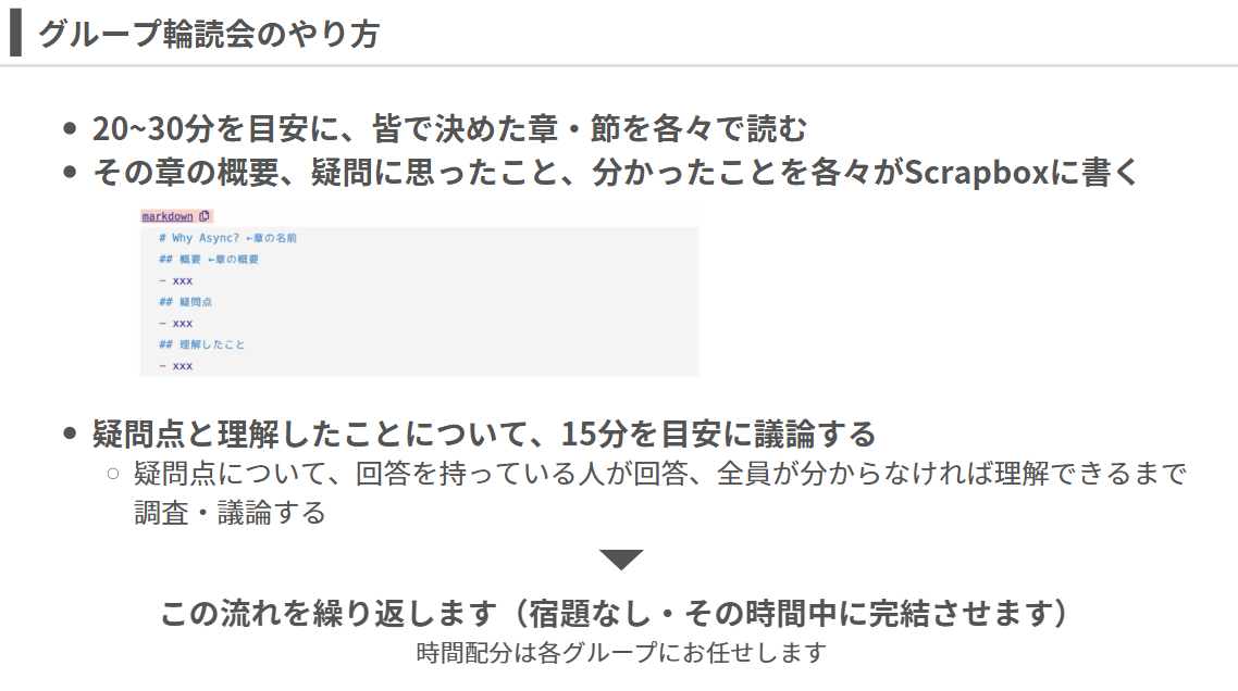 - 20~30分が経過したら、その後は15分ほど議論の時間を取ります。分かった人は自分の言葉で説明し、分からなかった人はその場で質問する。必要なら本を見返したり、メンバー同士で補足しながら理解を揃えていきます。
