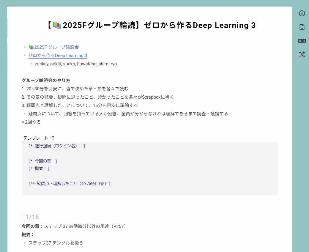 - まず各グループは20〜30分ほど、その日に決めた章や節を各自で黙々と読みます。その際、理解したことや疑問点を、各々がScrapbox(グループ共有のドキュメント上)に書き出します。