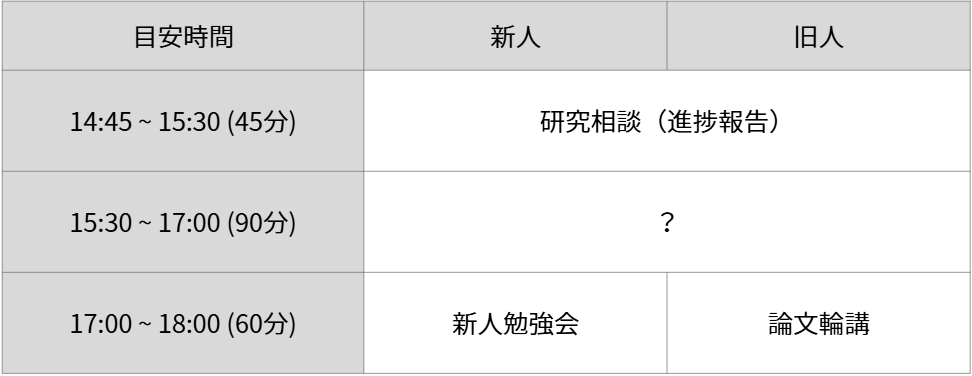 今までは進捗報告ミーティングを4限、論文輪講会を5限に行っていました。