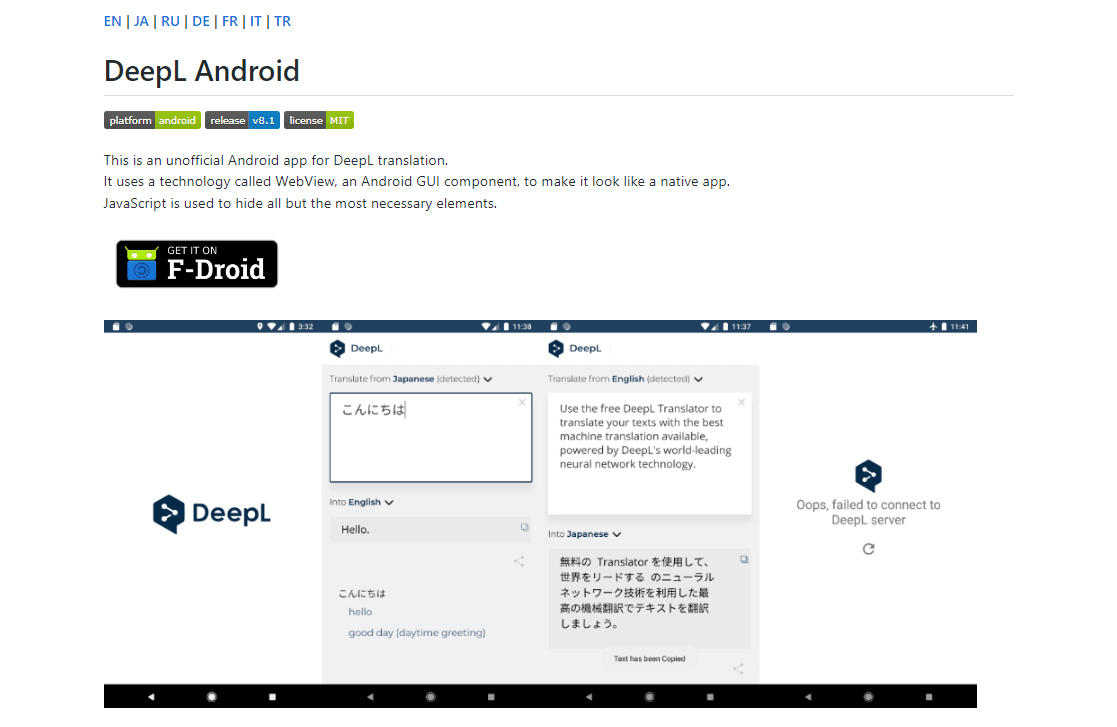 また、OSS専用アプリストアのF-Droidにリリースを行い、2021年から現在まで公開されています。 https://github.com/sakusaku3939/DeepLAndroid