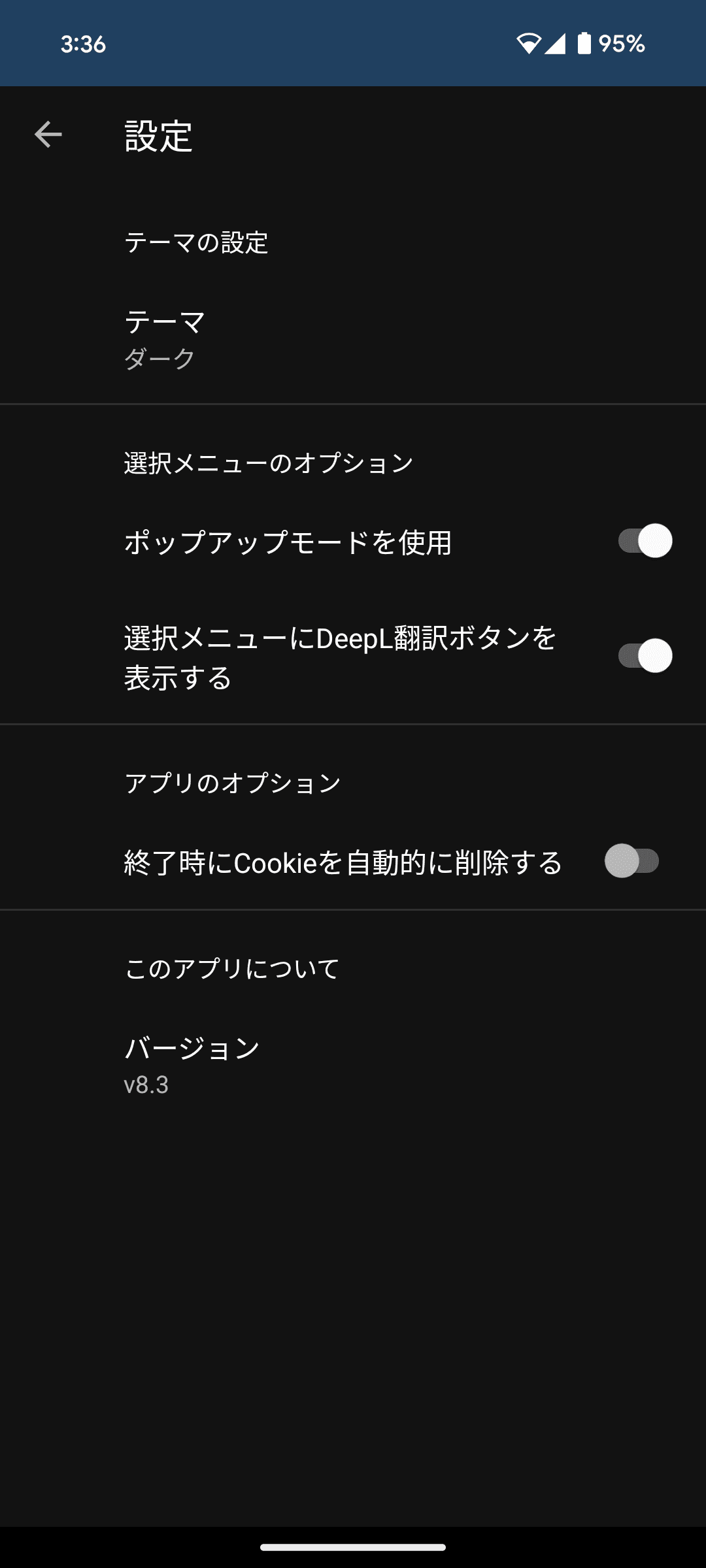 | 翻訳画面のみをWebViewで表示 | 選択メニューからDeepLアプリを起動 | 設定画面 (ダークモードへの切り替え) |