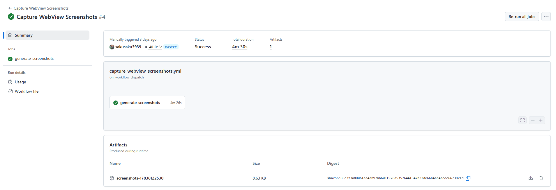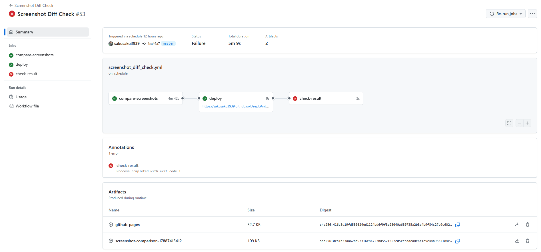 ただし、実際には対応の必要がない細かなデザイン変更も検知されてしまうことがあります。その場合でも、更新用のCIジョブを実行すれば、手作業でスクリーンショットを撮り直すことなく、新しいスクリーンショットを自動コミットできるようになっています。