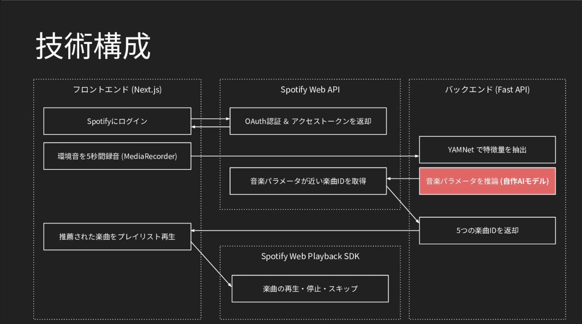 フロントエンドでは Next.js と Spotify Web API を用いて、Spotify のログイン機能や環境音の録音機能を実装しました。さらに Spotify Playback SDK を利用し、推薦された楽曲を再生できるようにしています。